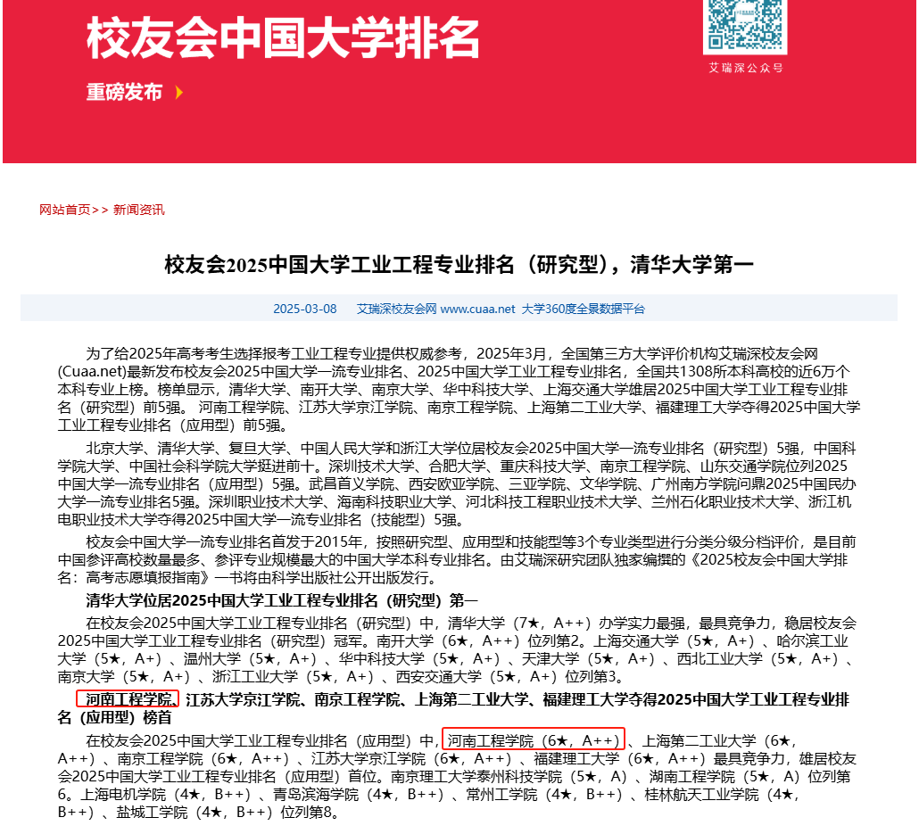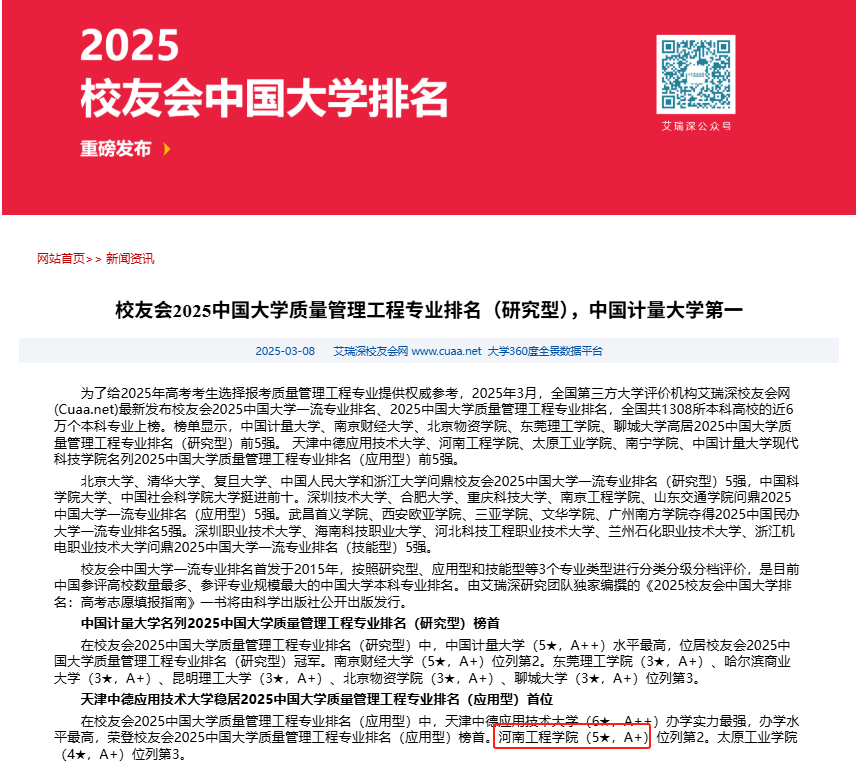 近日,全国权威第三方评价机构艾瑞深正式发布《校友会2025中国大学工业工程专业排名》《校友会2025中国大学质量管理工程专业排名》,这是该机构连续第12年发布校友会中国大学专业排名。我校管理工程学院的工业工程专业在2025中国大学工业工程专业排名(应用型)中,位列全国第1名(6★,A++);质量管理工程专业位列同类型专业全国第2名(5★,A+),双双跻身中国顶尖应用型专业行列。