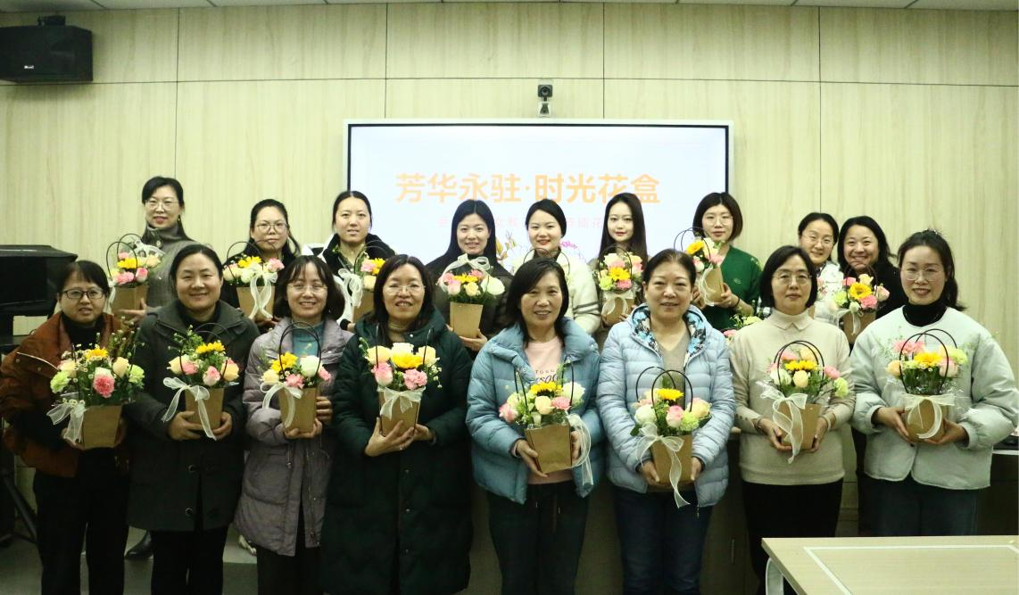 活动现场,女教工们热情高涨,气氛热烈。她们仔细挑选自己心仪的花束,精心构思、巧妙搭配,将原本普通的花材变成了一件件独具匠心,属于自己的花艺作品。在制作花篮的过程中她们互帮互助,交流着制作技巧和心得,整个活动充满了和谐与欢乐的气氛,这些花盒不仅展现了女教工们的心灵手巧和艺术修养,更寄托了她们对美好生活的向往和追求。