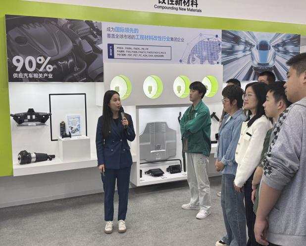 走进生产一线,解码“智造”密码。活动中,学生在企业安全员的指导下完成防护装备穿戴,依次深入氨纶二期车间、后纺三期生产线及聚合厂区,沉浸式学习化纤生产工艺全流程。在氨纶车间,技术骨干以“原料—纺丝—卷绕”为主线,详解氨纶纤维的制备技术与设备原理;聚合厂中控室内,技术人员通过实时监控大屏,向学生展示智能化控制系统如何精准调控聚合反应参数,并阐释工艺优化的创新突破;锦纶生产线上,切粒机的自动化运作与切片投料、成品包装的高效衔接,更让学生直观体会到智能制造对产业升级的驱动作用。面对复杂的生产场景,学生们全程认真观视,此刻,课本上的聚合反应方程式,在这里变成了轰鸣的设备和流动的产品。