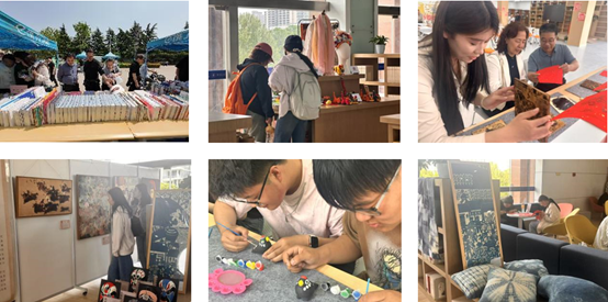 本次文化展以非遗实物、图片、图书为载体,构建跨地域、跨民族的文化对话空间,展区由展览区和互动区组成。展览区,维吾尔族热瓦普琴、乌孜别克族都塔尔与中原朱仙镇木版年画同台展陈,钧瓷“窑变”紫霞与景德镇捏雕技艺交相辉映,壮锦团扇经纬与黄河古陶纹路共述文明交融。互动区,师生可通过雕版印刷、珐琅点蓝、竹编制作等实践,在指尖触摸中华民族共同体记忆。
