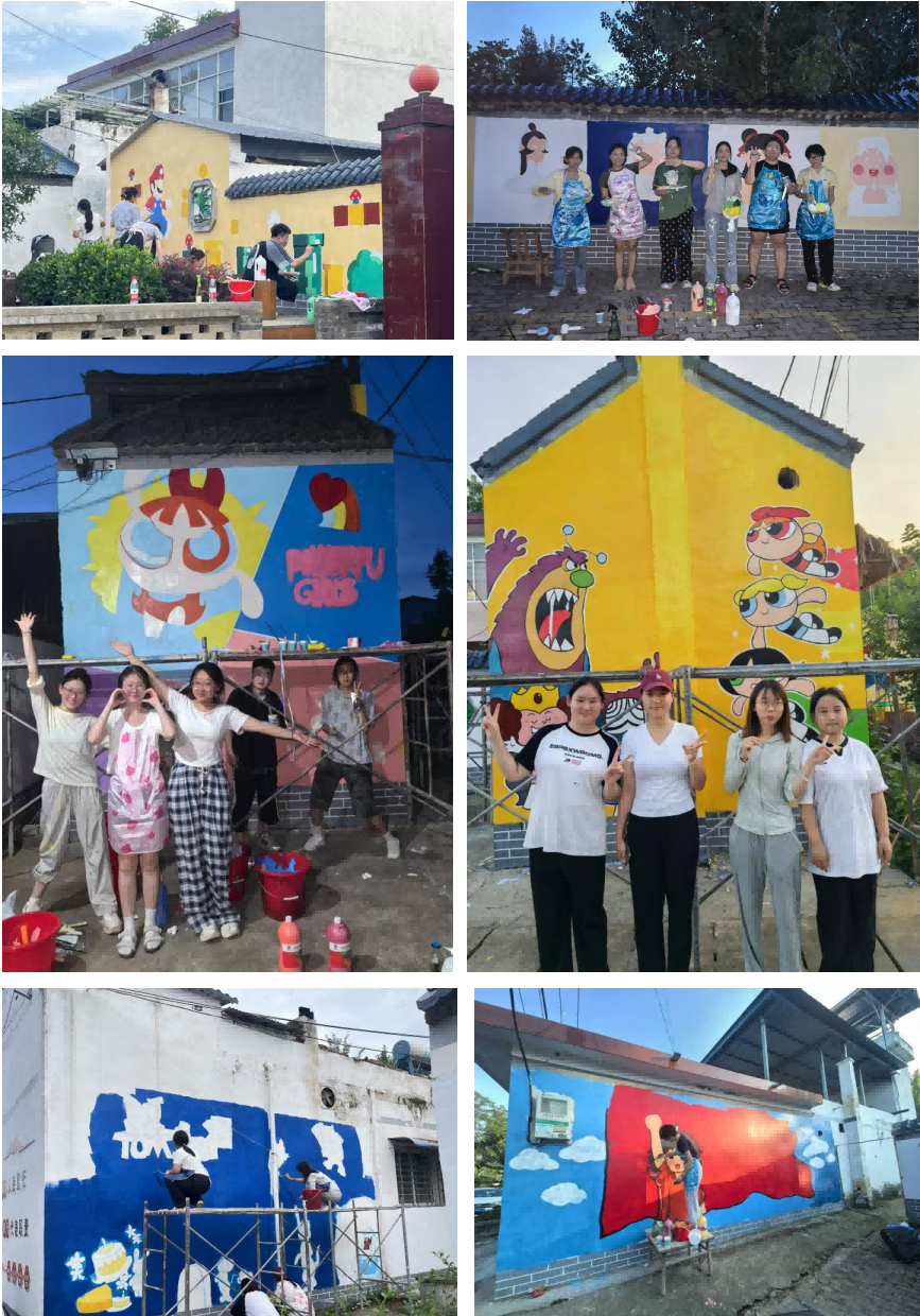 实践过程中,团队成员不畏酷暑,每日早早来到墙绘现场,认真准备颜料、整理素材,从用粉笔定点勾勒轮廓,到用丙烯颜料细致上色,每一个步骤都一丝不苟,累计完成14面墙绘,总计约240平方米。在大家的共同努力下,将原本朴素的乡村墙面,变成了充满活力与趣味的艺术长廊,这些墙绘不仅为村庄增添了绚丽色彩,美化了乡村环境,也为村民们带来了新的视觉享受,更成为传播乡村文化的生动载体。