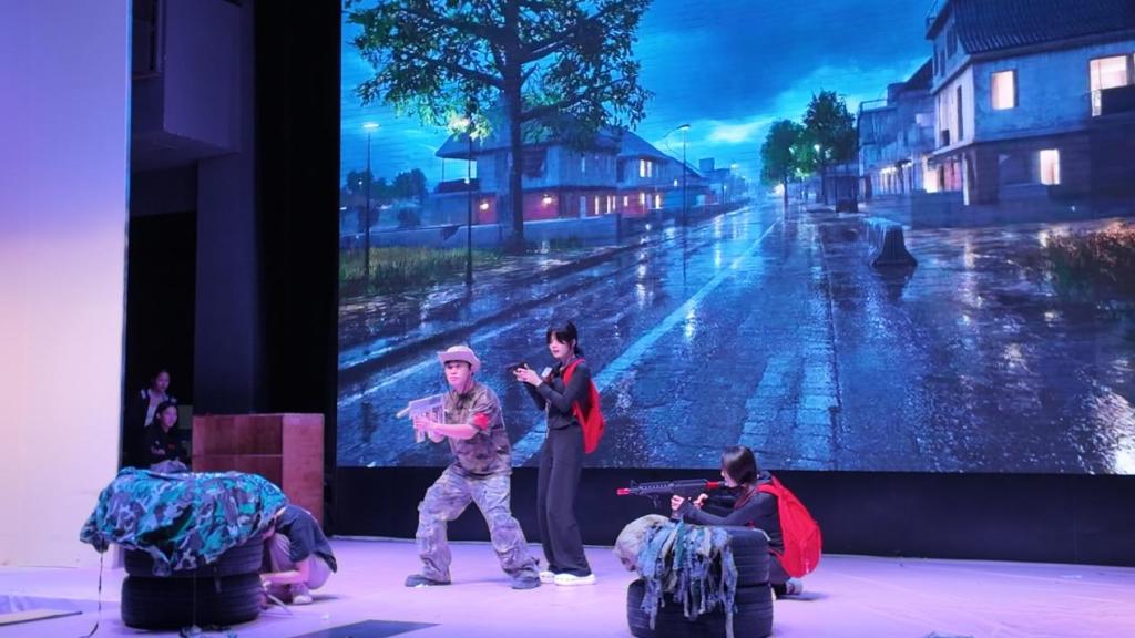 《头号玩家》将科技与幻想元素融入剧情,营造出一个充满未来感的虚拟世界。演员们通过富有张力的表演,展现了主角在虚拟与现实之间的冒险与成长。道具组灵活运用旧展板、纸箱、废弃轮胎等日常废弃材料,手工打造出符合游戏氛围的舞台布景和道具,既体现环保创意,也强化了作品的真实感和沉浸感。